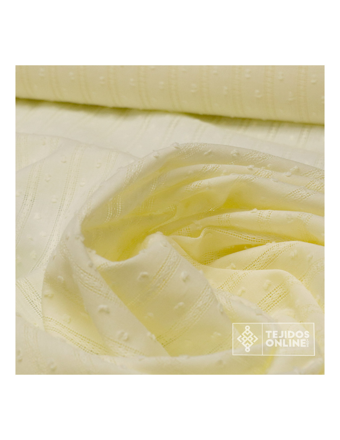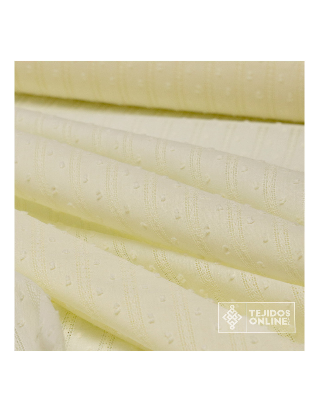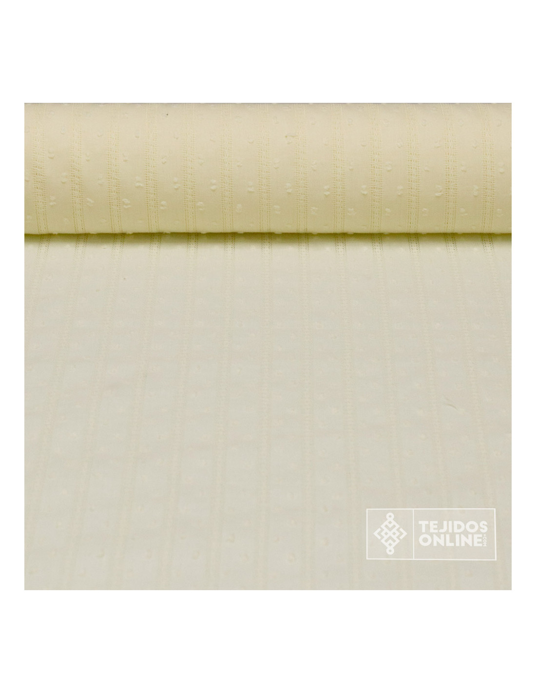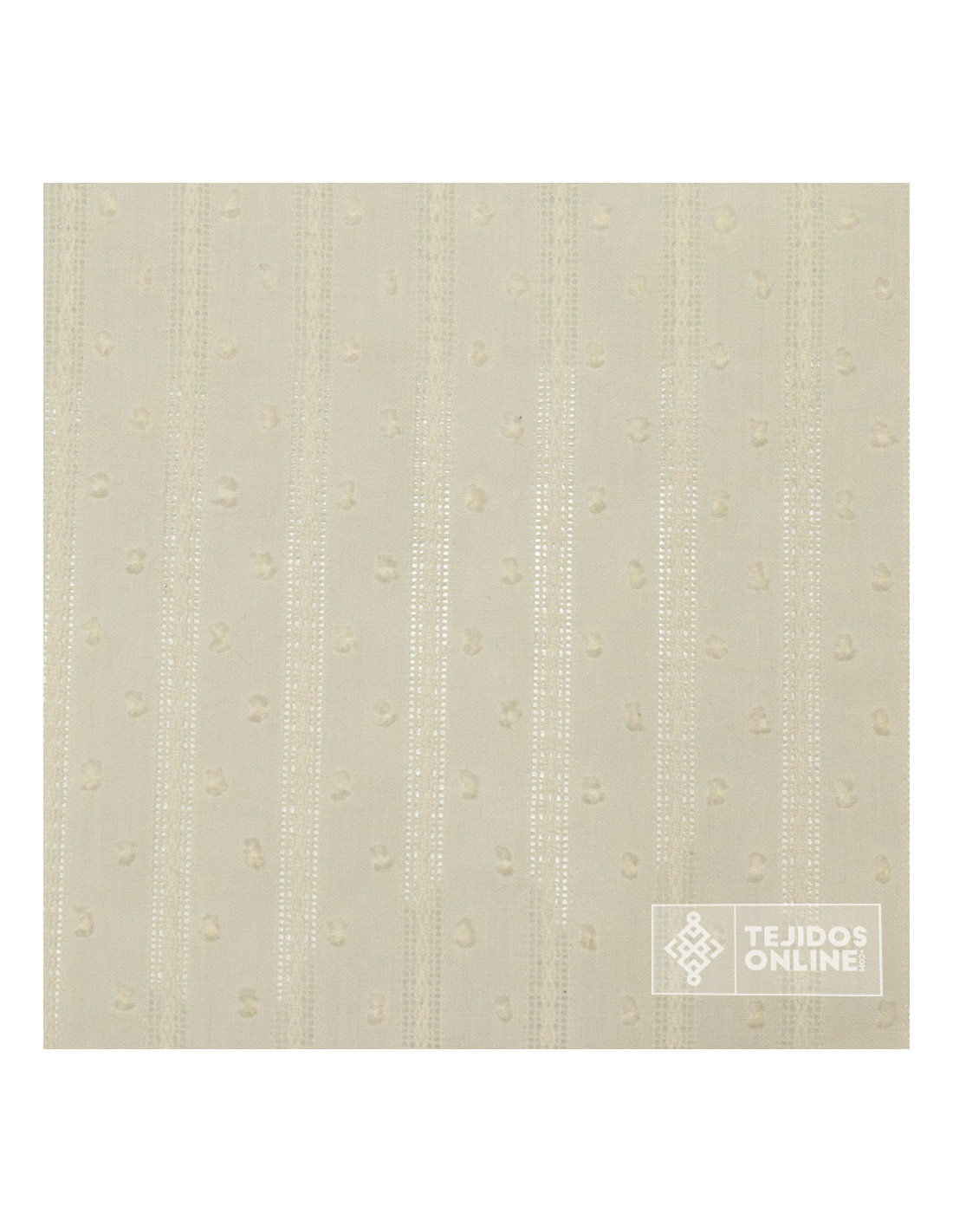 Batista 100% algodón con plumeti y finas rayas caladas dispuestas de forma regular (separación aprox. 1,5 cm). Disponible en blanco y beige. Es una tela fresca, muy suave y fácil de combinar.