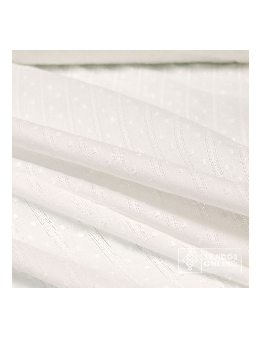 Batista 100% algodón con plumeti y finas rayas caladas dispuestas de forma regular (separación aprox. 1,5 cm). Disponible en blanco y beige. Es una tela fresca, muy suave y fácil de combinar.