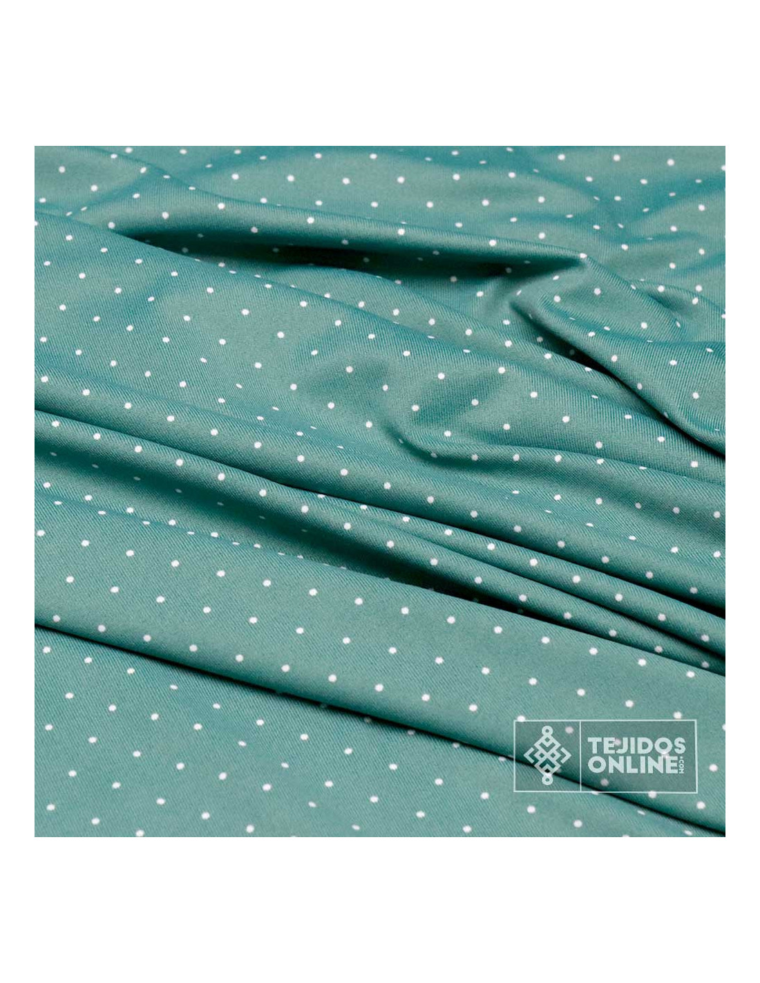 Nuestra Tela Lycra De Baño Verde Agua Lunar Blanco es un tejido con bastante caída, con lycra, cierto peso y muy suave. Tela de lyra en fondo verde agua con estampaciones de pqueños lunares de color blanco. Es una tela doble de ancha, con peso, movimiento y bastante elasticidad lo que la hacen ideal para proyestos que se adapten a nuestro cuerpo.