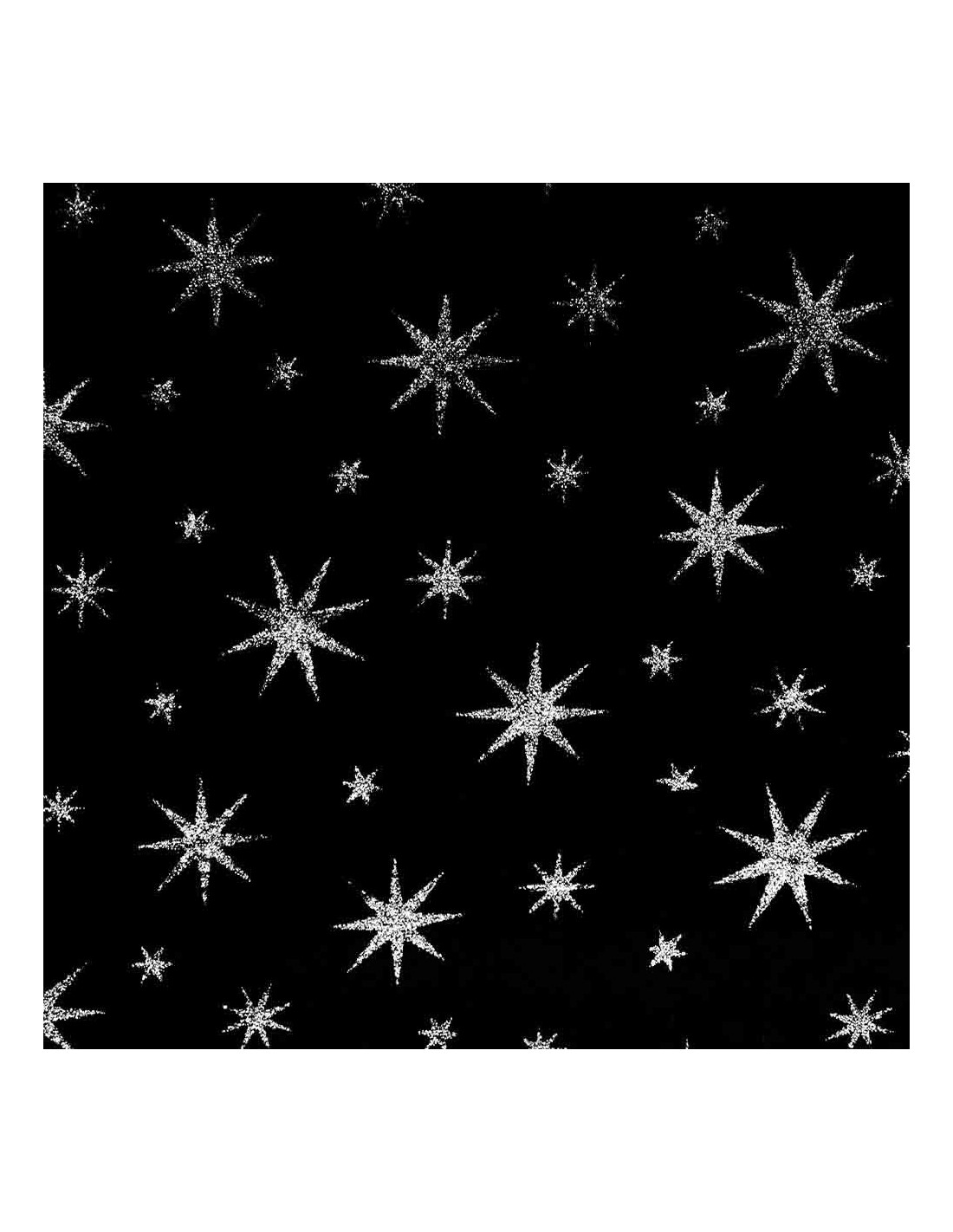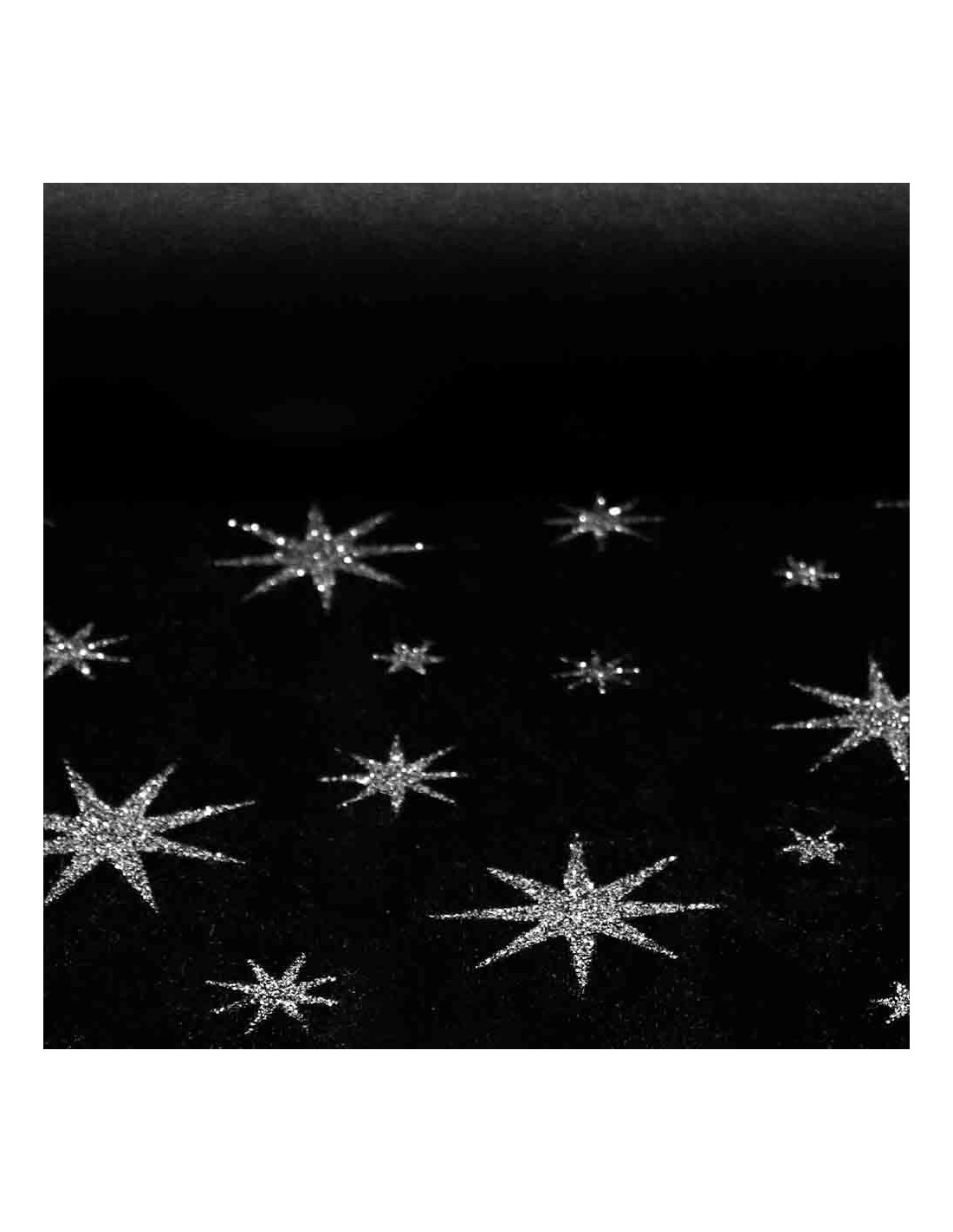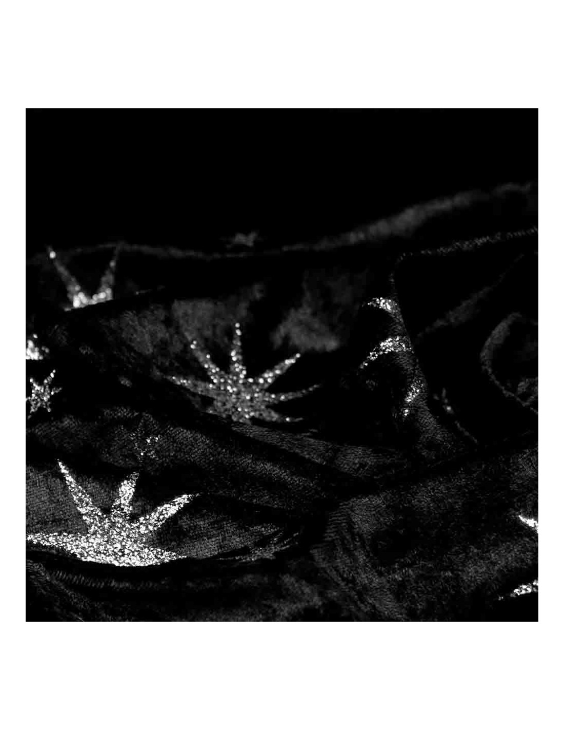 Terciopelo Estrella Purpurina, tejido con suavidad, con gran caída y de textura aterciopelada. Tejido con estampados estrellas formadas en purpurinas pegadas al tejido, siendo en el fondo negro de color plata y demás en color dorado. Tela que no ofrece resistencia al corte, tejido utilizado principalmente para, carnaval y manualidades. Consejos para su corte; cortar con tijeras bien afiladas, y colocar debajo de una tela de algodón para evitar su deslizamiento. Reforzar patrones con alfileres o pesas.