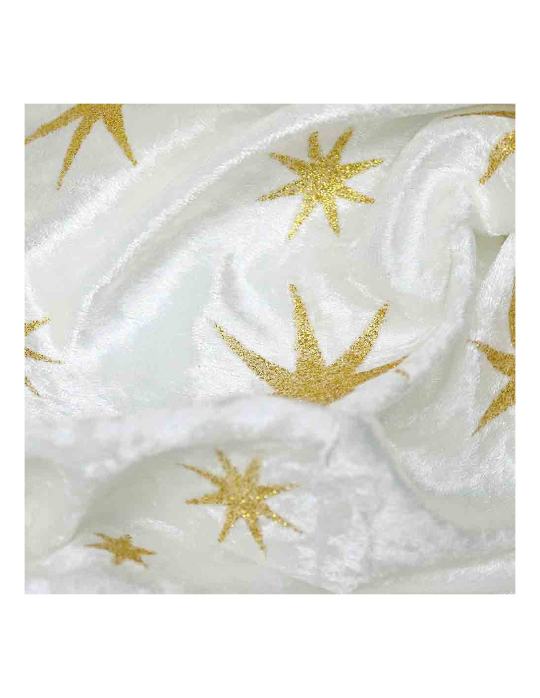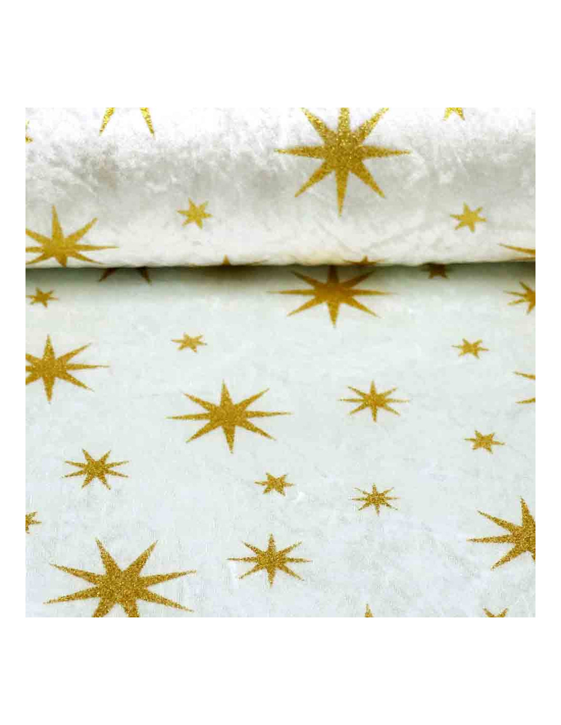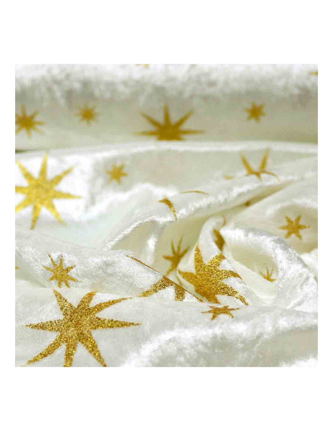 Terciopelo Estrella Purpurina, tejido con suavidad, con gran caída y de textura aterciopelada. Tejido con estampados estrellas formadas en purpurinas pegadas al tejido, siendo en el fondo negro de color plata y demás en color dorado. Tela que no ofrece resistencia al corte, tejido utilizado principalmente para, carnaval y manualidades. Consejos para su corte; cortar con tijeras bien afiladas, y colocar debajo de una tela de algodón para evitar su deslizamiento. Reforzar patrones con alfileres o pesas.