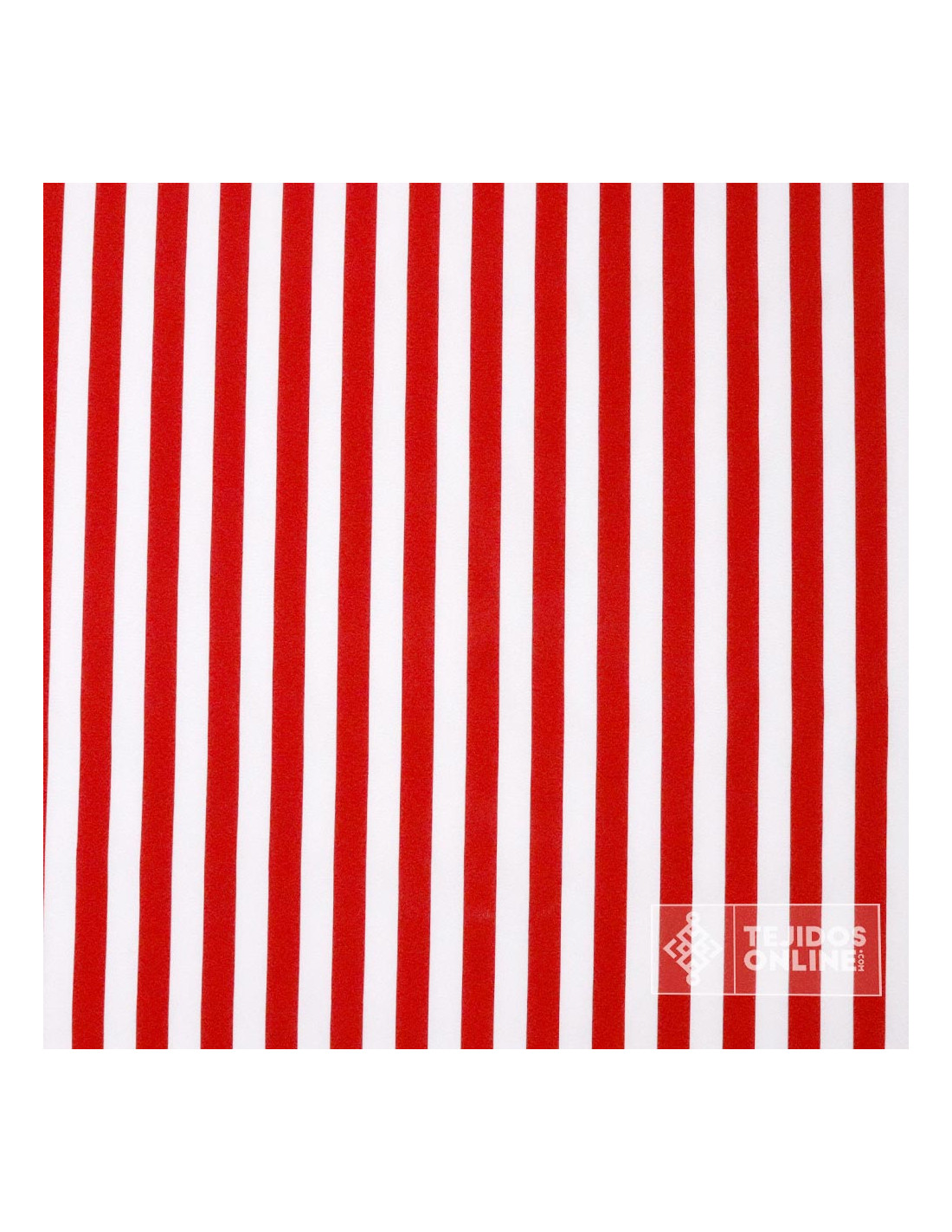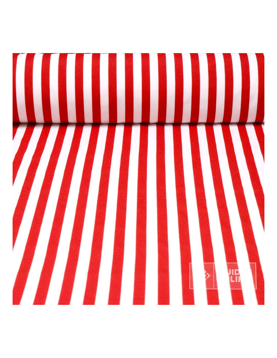Te presentamos una tela stretch 100% poliéster con un estampado de rayas en blancas y rojas con un grosor de raya de unos 2cm. La rayas están estampaddas de forma vertical a su ancho. Es un tejido con caída, buen vuelo y cuerpo medio: fácil de coser porque no ofrece resistencia.