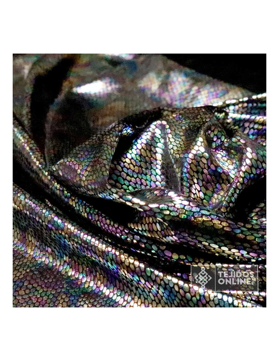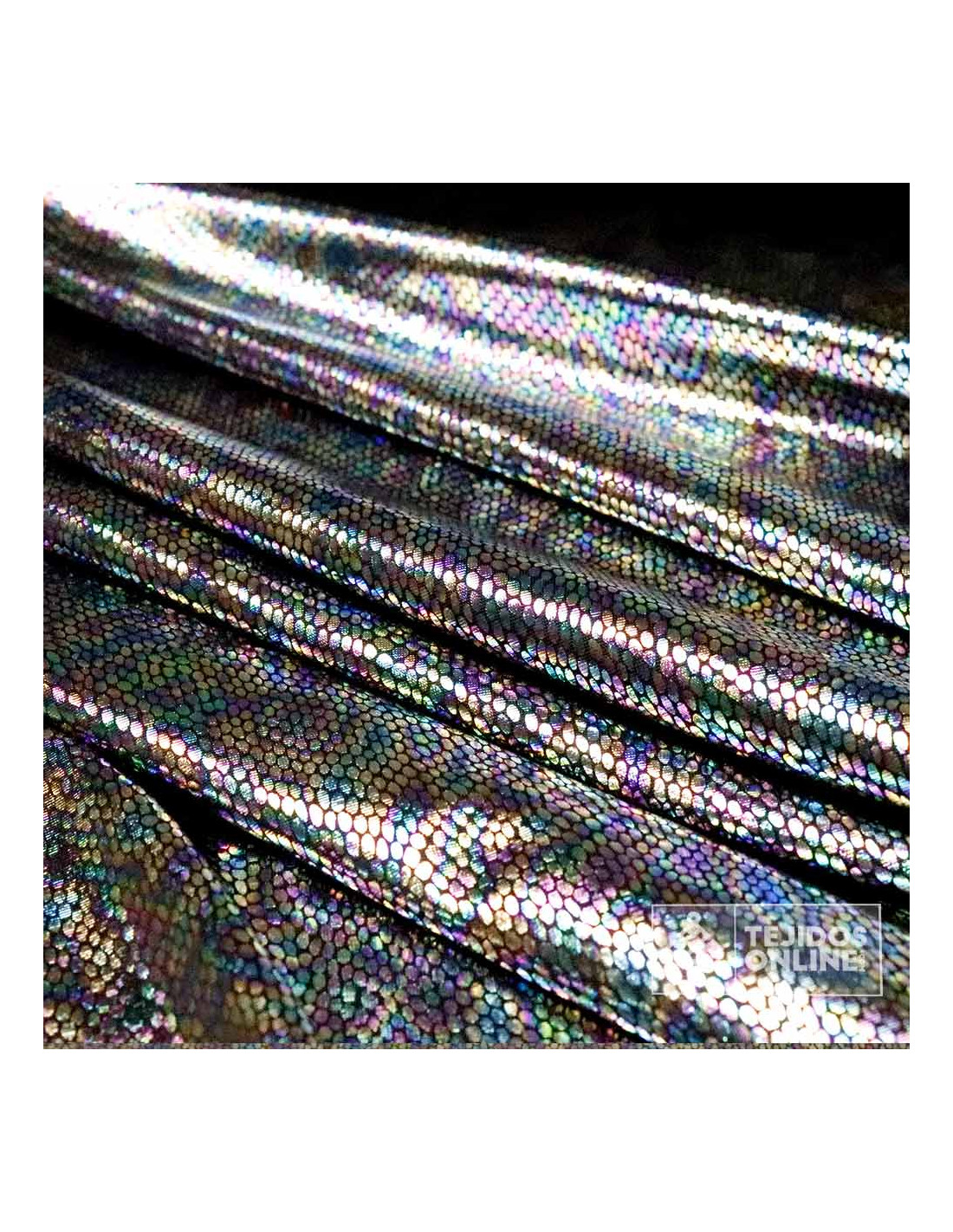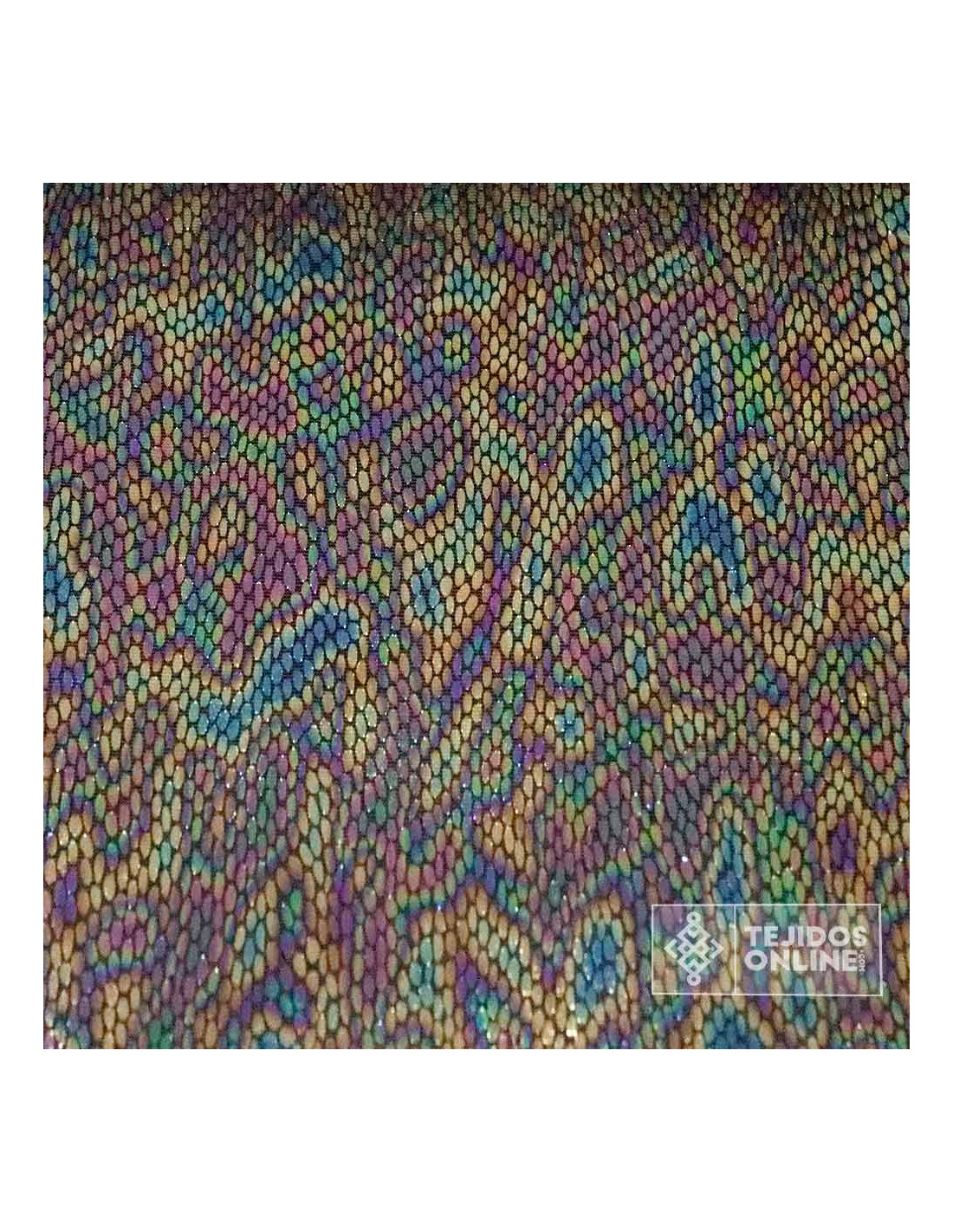 Nuestra tela de punto con estampado piel Cascabel Multicolor luce un acabado brillante tipo foil que cambia según la luz. La base malva aporta profundidad y hace que los tonos multicolor destaquen con según el efecto. Es un tejido con elasticidad y buena recuperación, suave al tacto y con caída suficiente para prendas ajustadas o con movimiento.