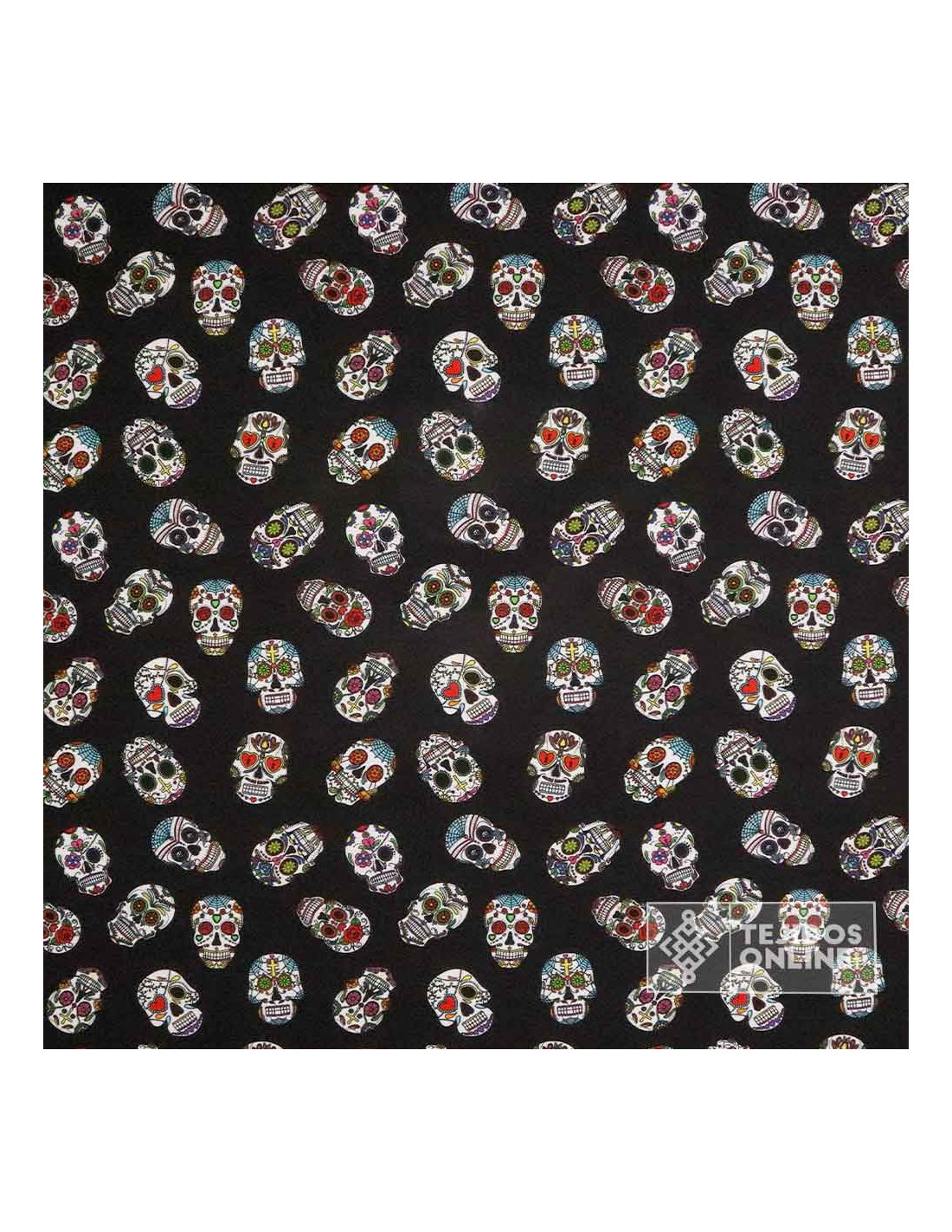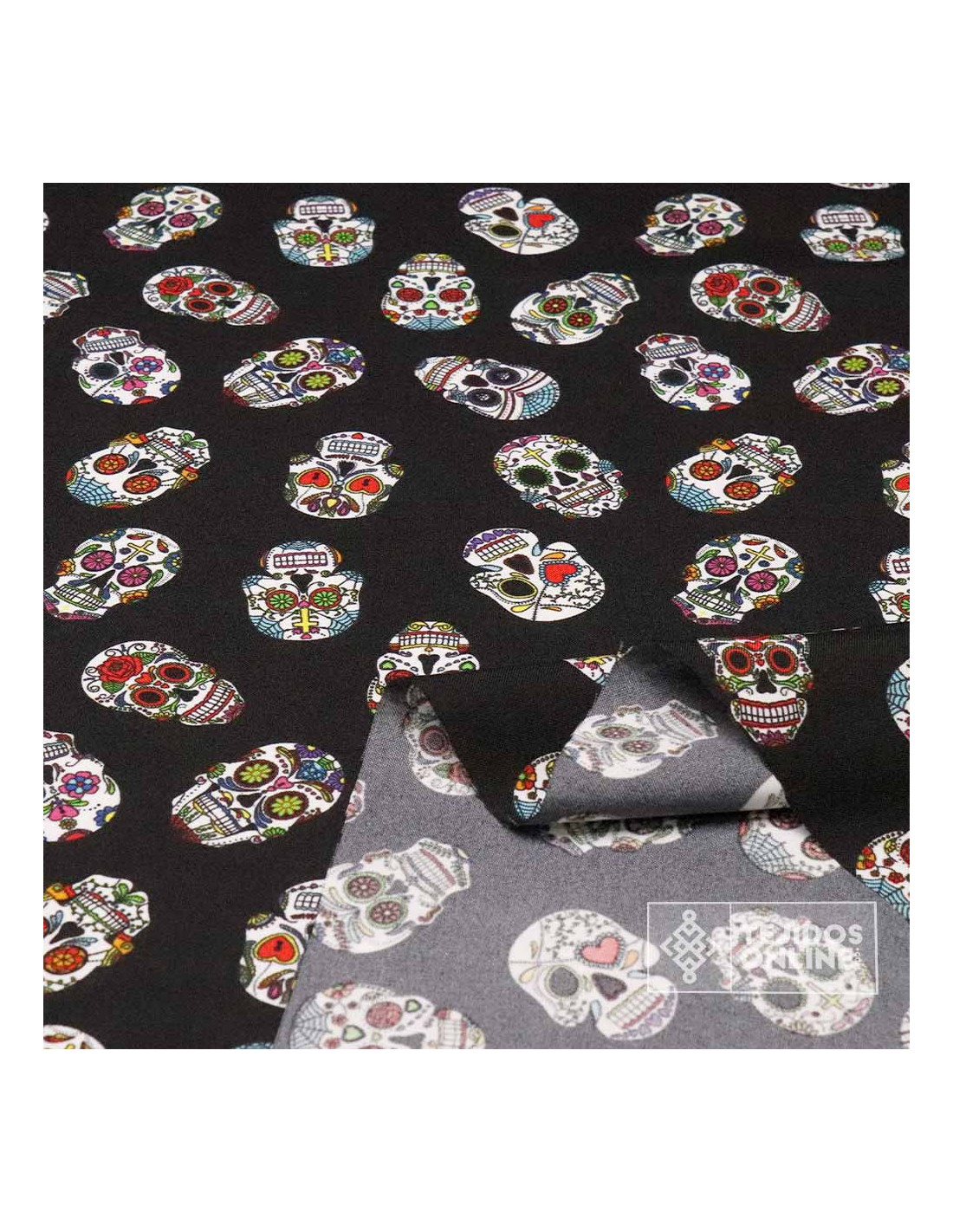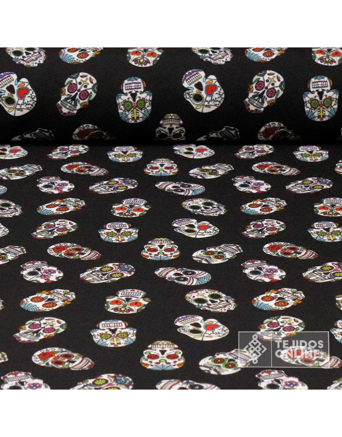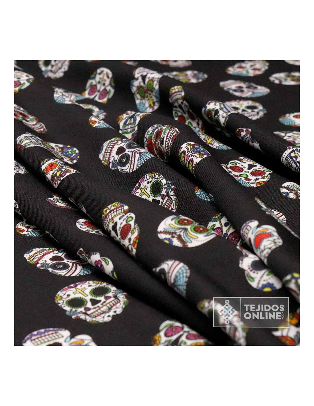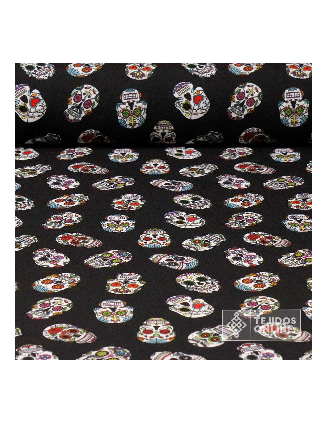 ¿Buscas un tejido de carabelas catrina? la Tela Carabelas Catrina es perfecta para ti. Con sus estampados de crabelas al estilo catrinas o mexicanas donde predominan sus estampados de coloridos y sobre fondo negro la hacen perfecta para cualquier proyecto de carnaval o halloween. Esta tela es un tejido que destaca por ser una tela con movimiento, caida, de poco peso y muy resistente.