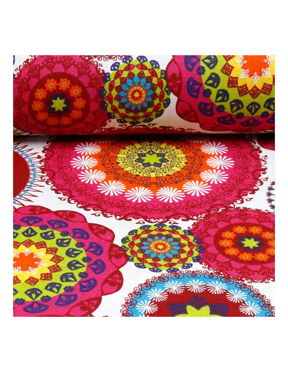 Loneta Mandala Multicolor. Telas de Mandalas Multicolor, predominando el color fucsia, naranja y su fondo en blanco. La Loneta Mandalas es un tejido ideal para todo tipo de cortinas y para proyectos de manualidades enfocados a gran variedad de estilos. Tela de mandalas de un tacto suave, con cierto cuerpo. Tejido utilizado para todo tipos de confecciones como; (colchas, cortinas, manteles, tapicería, etc…).