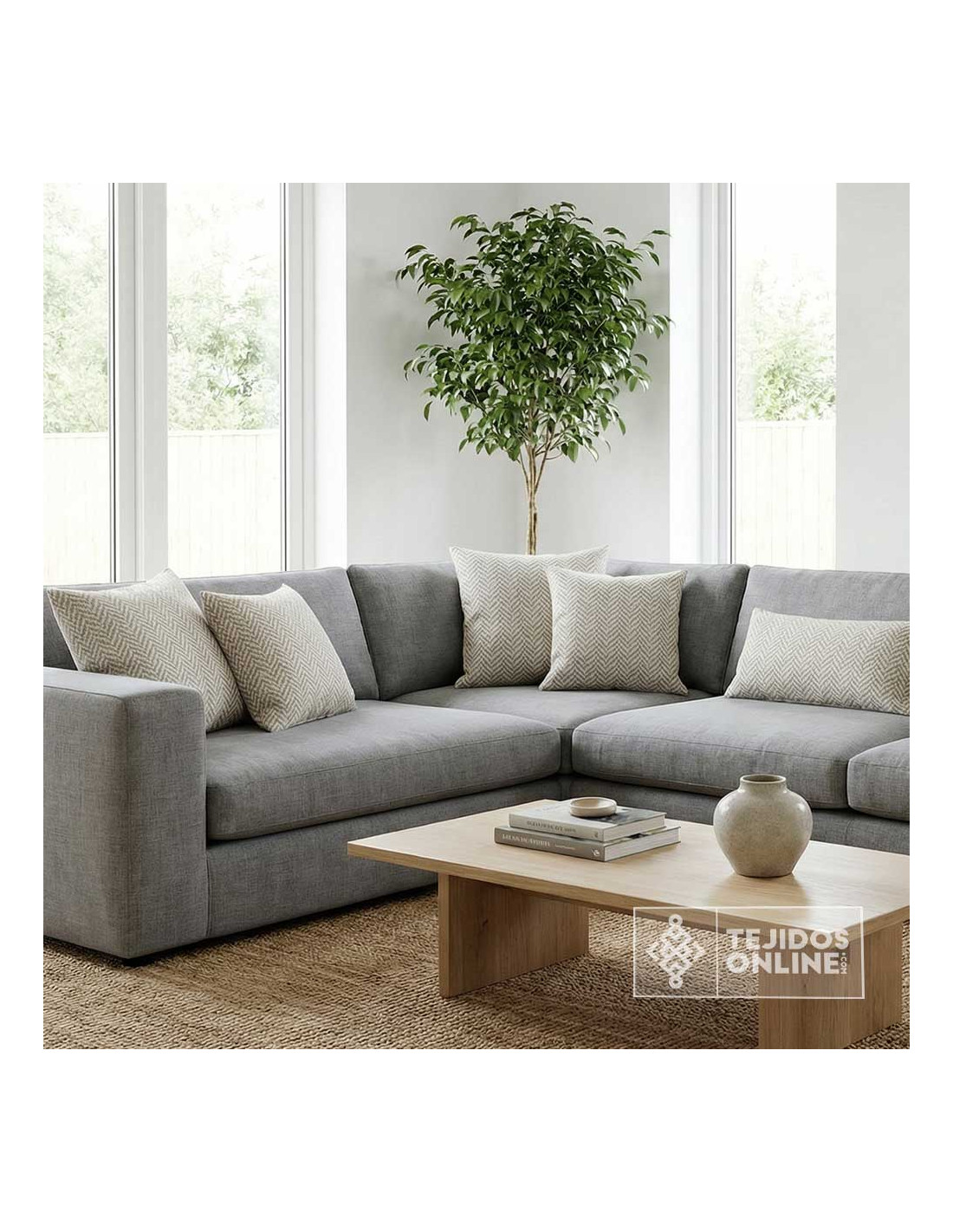 Si buscas un tejido duradero, con estilo y preparado para vestir cualquier estancia con un toque limpio y moderno, esta tela de espigas será tu favorita.