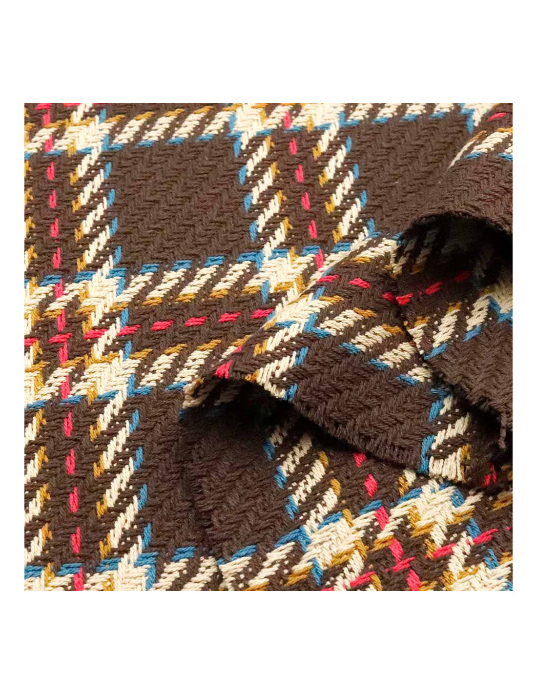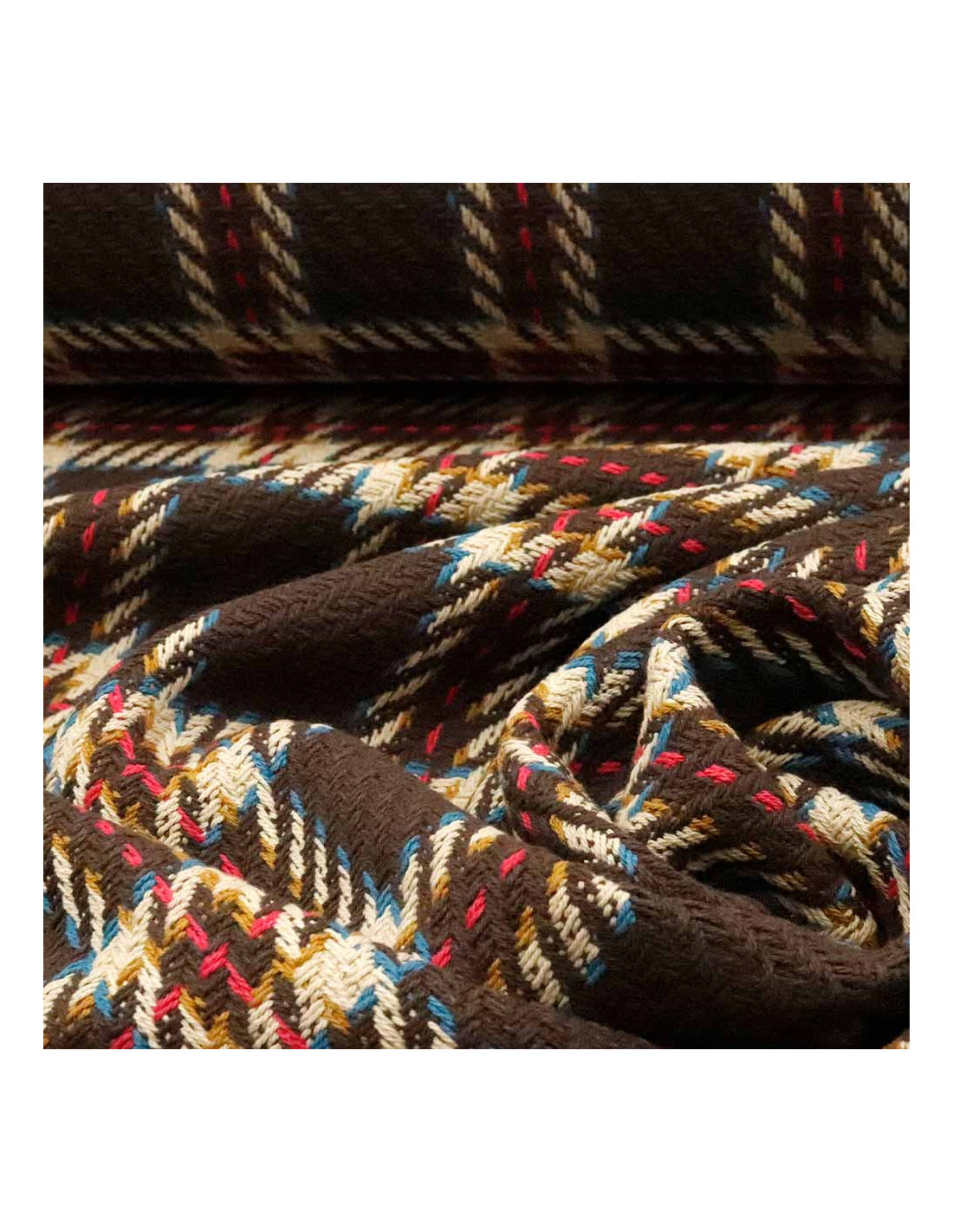 Lana Cuadros Mansell, es un tejido con cuerpo, con grosura, suave y resistente. Tejido utilizado para todo tipos de confecciones como; abrigos, chaquetas, faldas, y todo tipos de proyectos de moda. En galería podréis observar una imagen del revés de este tejido. Tejido de lana formando un tramado de líneas creando cuadros predominando las tonalidades marrones, y destacando unas tramas azules y rosas.