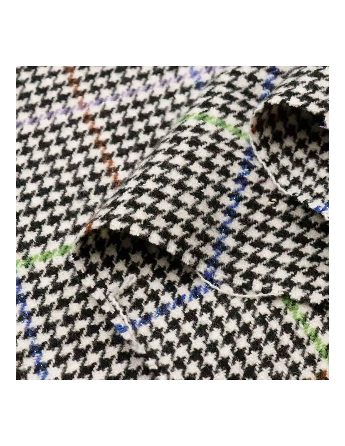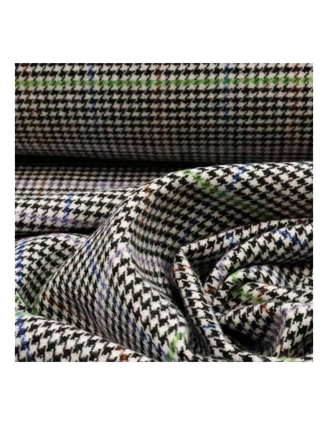 Lana Pata Gallo Rayas Colour es un tejido con cierto cuerpo, suave y resistente. Tejido utilizado para todo tipos de confecciones como; abrigos, chaquetas, faldas, y todo tipos de proyectos de moda. En galería podréis observar una imagen del revés de este tejido. Predomina su dibujo de pata de gallo y sus líneas verdes y azules.