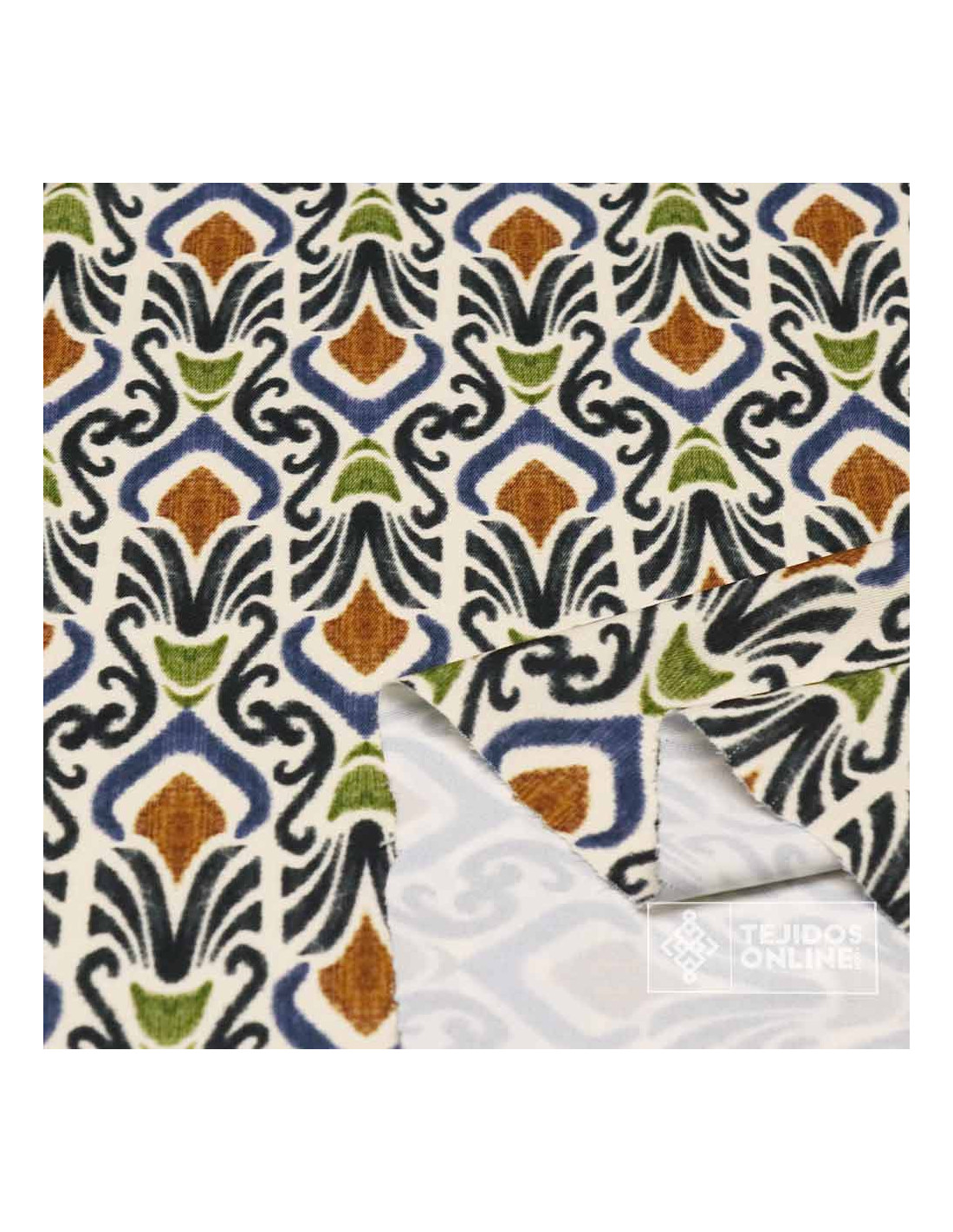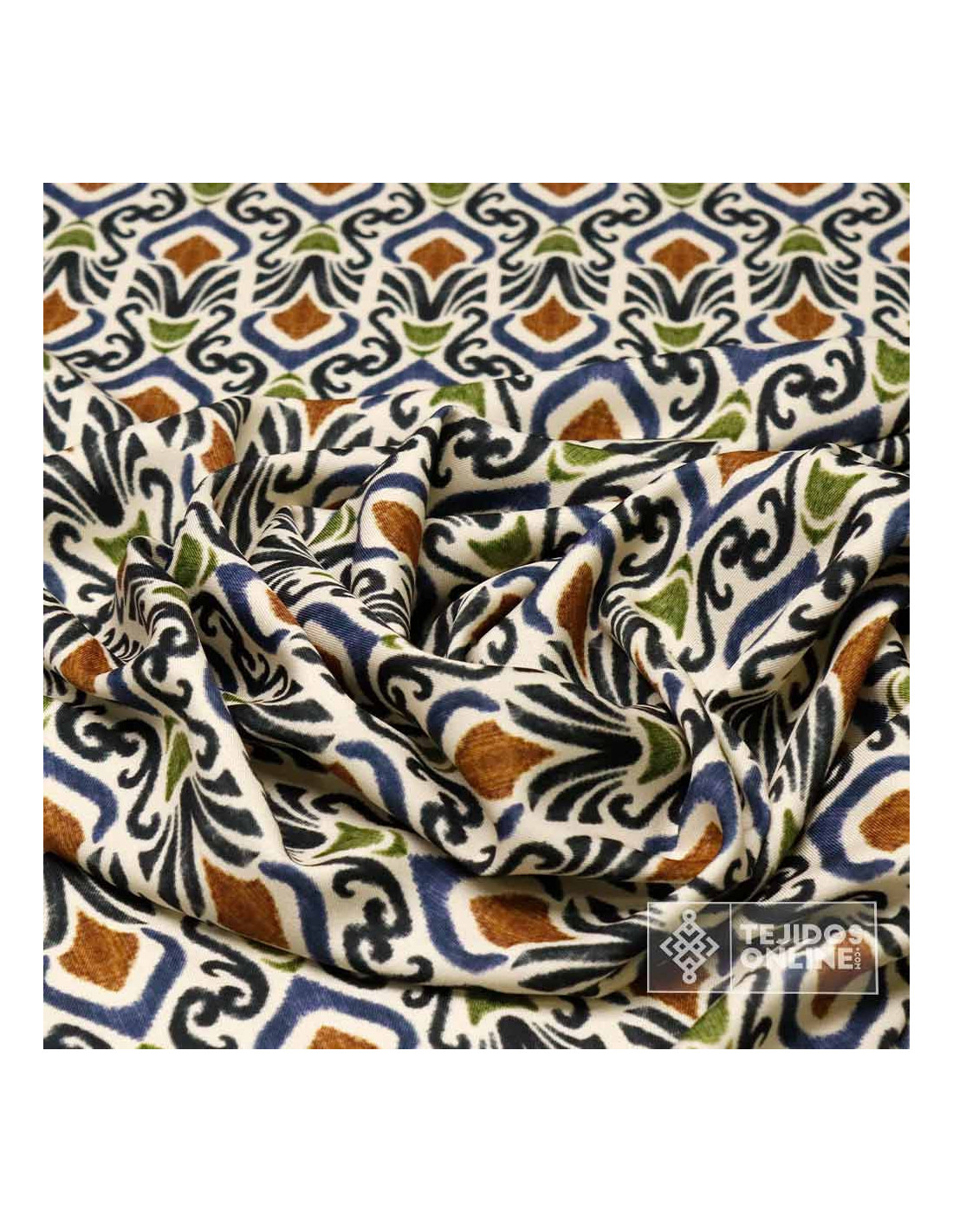 ¿Enamorado/a de los estampados originales?, conoce la Tela Lycra con Diseño Étnico Ornamental siendo una tela con elasticidad, con colorido intenso y la elegancía que toda persona busca para cualquier proyecto de moda. El crep de lycra estampado se caracteriza por ser una tela para prendas de moda donde su principal función es su adaptabilidad al cuerpo y comodidad gracias a su licra. Esta tela estampada mezcla clores en tonos calderas y berenjena sobre un fondo de color beige o crema.