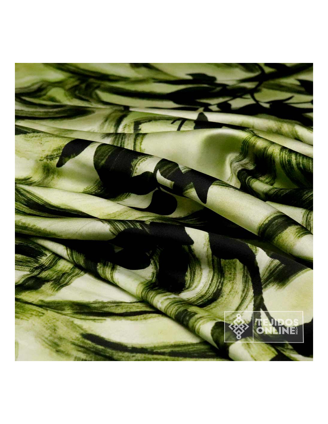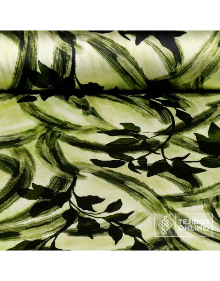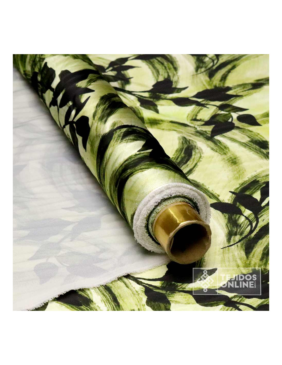 Nuestra tela crep raso con lycra luce un estampado de hojas y pinceladas pinceladas artísticas en tonos verde o camel. Tiene tacto sedoso, caída fluida, un ligero brillo satinado y un punto de elasticidad que aporta confort y mejor ajuste en las prendas. Es perfecta para piezas versátiles y con movimiento.