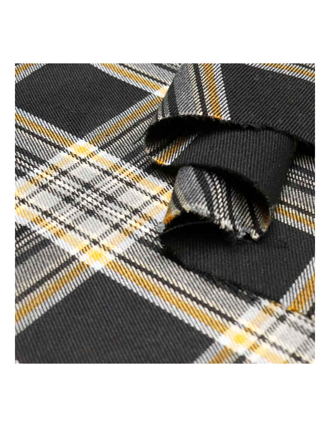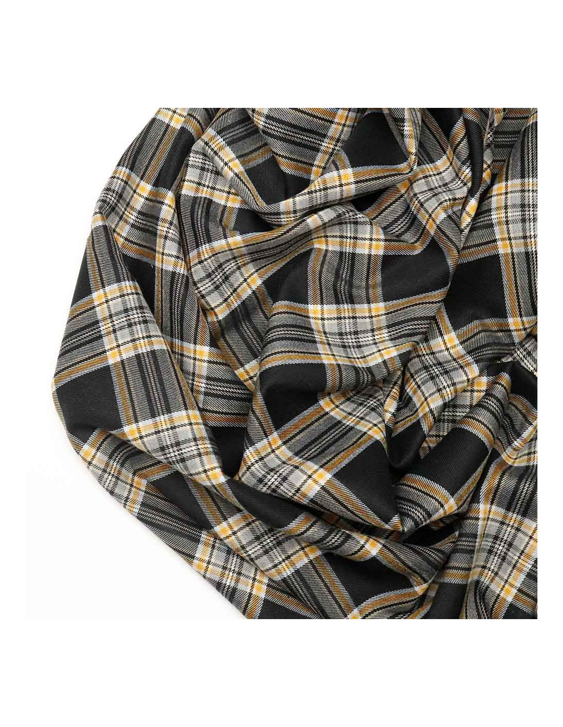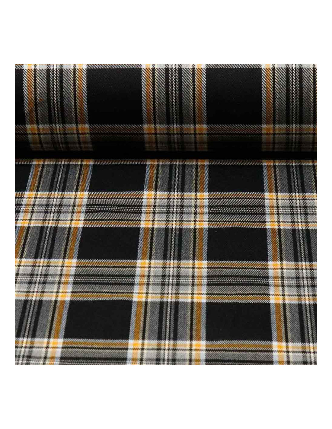 Cuadro Escocés Amarillo, es una tela clásica y elegante, de cierta grosura, con caída y cierto peso. Tejido con el cuerpo justo para crear estructura a la prendas. Se caracteriza por su suavidad, y estampado de dibujos de cuadros escoceses predominando su tonalidad amarilla y fondo negro. Este tejido, es ideal para todo tipo de confecciones como: vestidos chaquetas, faldas, chalequillos de hombres, proyectos escolares, etc…