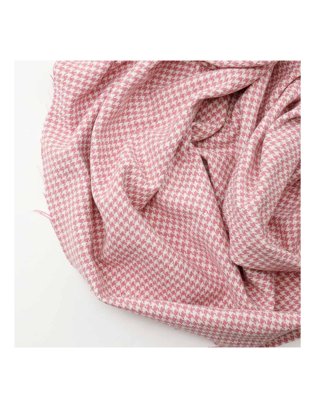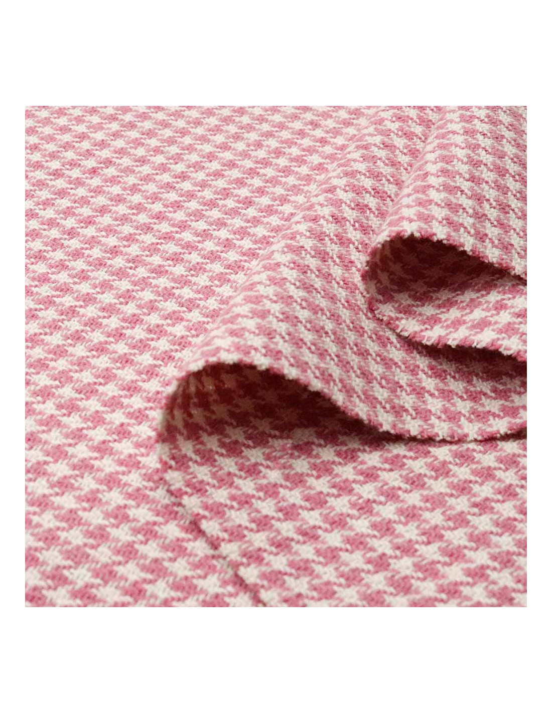 Lana Pata Gallo Color, tela de lana de cierto grosor en formas de la conocida para de gallo con tramados cremas y otros de color negro, naranja o rosa. Tejido elegante, con cierto cuerpo y cierto peso. Tejido con el cuerpo justo para crear estructura a la prendas y de primera calidad. Este tejido, es ideal para todo tipo de confecciones como: chaquetas, faldas, abrigos, bufandas, etc… En galería os mostramos una imagen del revés de este tejido.