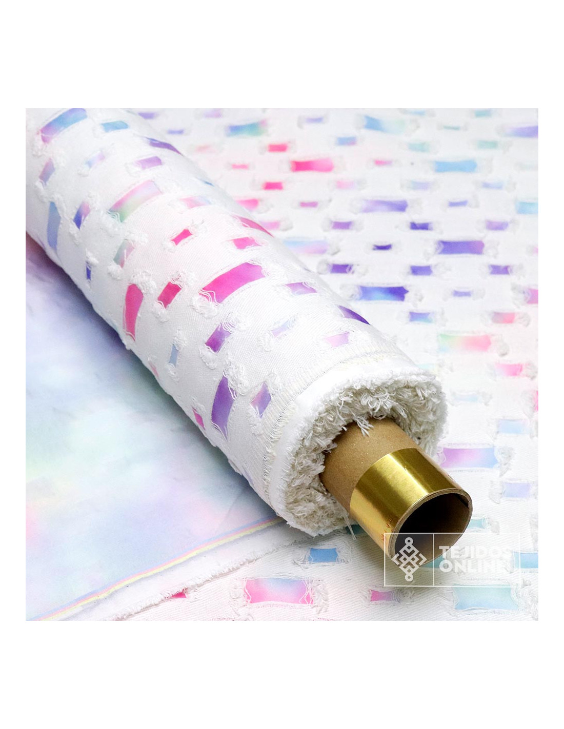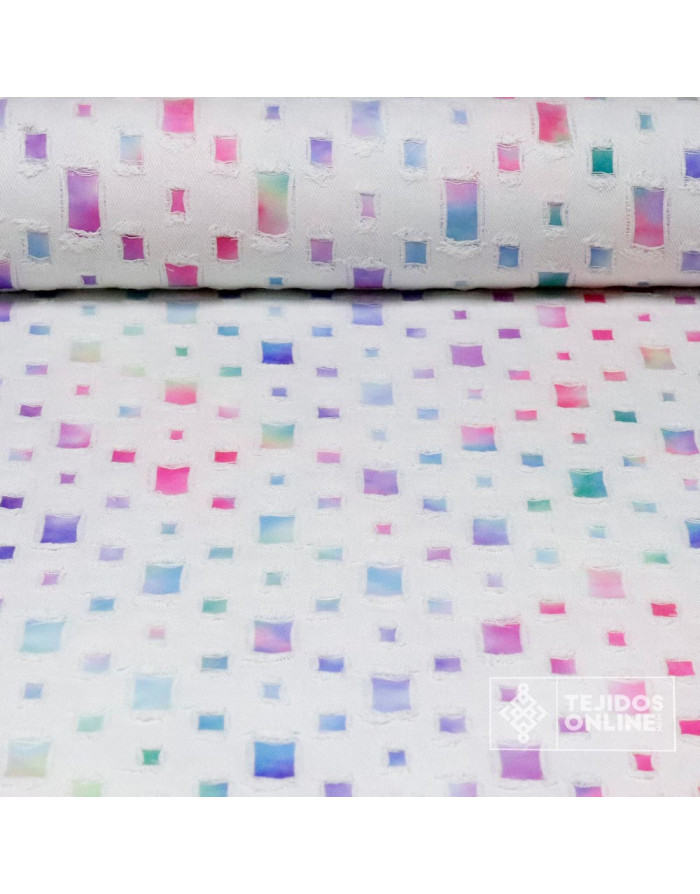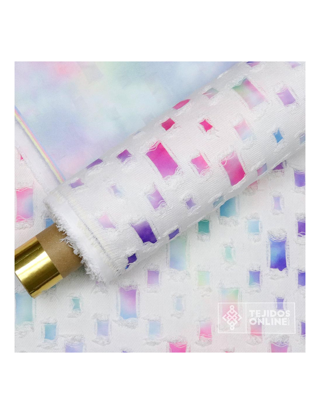 Te presentamos la Tela Vaquera Fantasía Multicolor, destaca por su estampado efecto "patchwork" multicolor en tonos pastel y vivos, con formas rectangulares irregulares y bordes deshilachados que crean una textura visual muy llamativa. El diseño presenta una base blanca que permite resaltar los recortes de colores degradados como rosa, lila, azul, verde y fucsia, aportando un aire moderno y creativo al tejido.