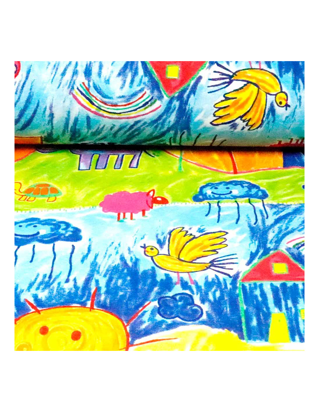 Loneta Colegio, es un tejido con cuerpo, con cierta finura y resistente. Tejido con estampación de paisaje infantil de fondo, soles, casas, animales, árboles, etc… Tejido de muy buena calidad y fantástico colorido. A tener en cuenta, tejido con estampación a pié. Es decir, tejido con anchura de 1,40 mtr ó 2,80mtrs. Los dibujos en una sola dirección. Tejido utilizado para todo tipos de confecciones como; (manualidades, cortina, manteles, tapicería, etc…)