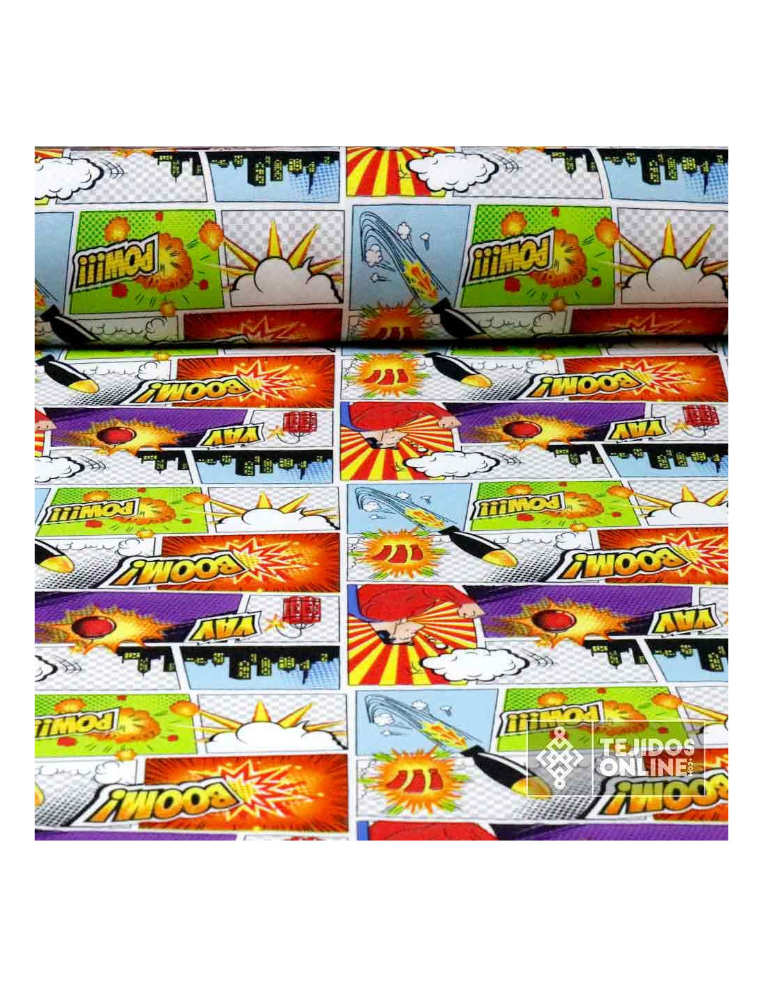 Stretch Comic Pow, tejido con caída, vuelo y cuerpo siendo así una tela fácil de coser ya que no ofrece resistencia. Tejido estampados de comic. Tejido utilizado para todo tipos de confecciones como; (vestidos, camisas, faldas, y todo tipo de proyectos para carnaval). Consejos para su corte; no es necesario seguir la dirección del hilo. Tela que no necesita planchado y no se arruga.