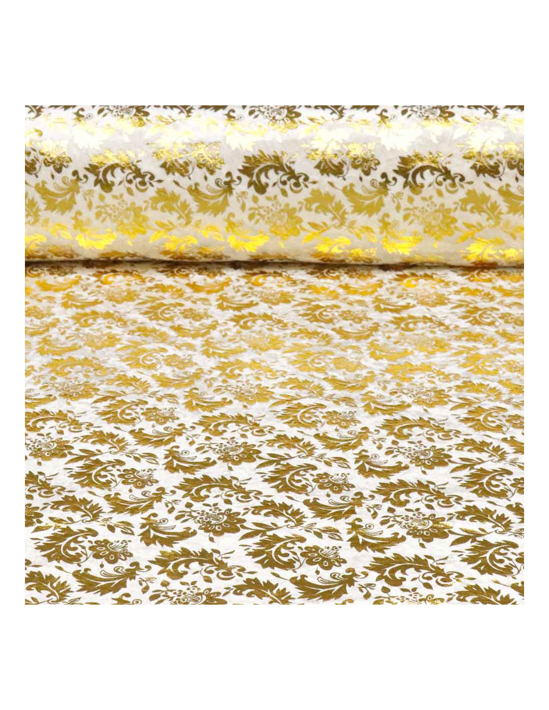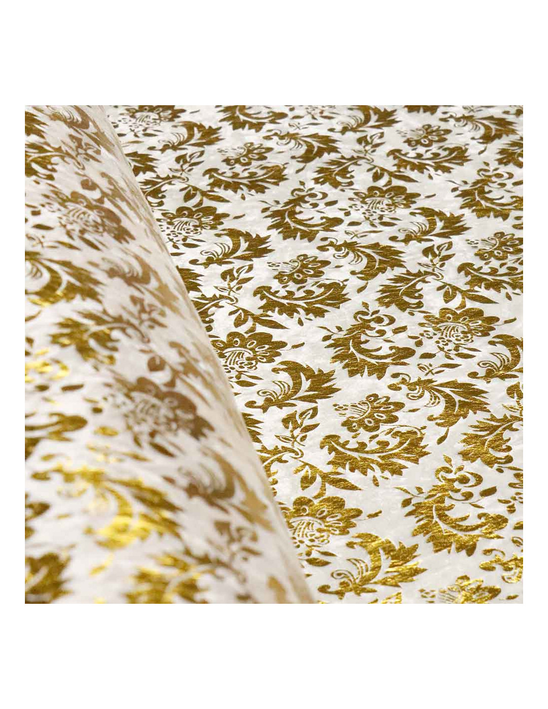 Terciopelo Blanco Pan de Oro, tejido con suavidad, con gran caída, de textura aterciopelada, con estampados dorados en formas de flores sobre un fondo de terciopelo color blanco. Tela que no ofrece resistencia al corte, tejido utilizado principalmente para confecciones de cofradías, carnaval y manualidades.