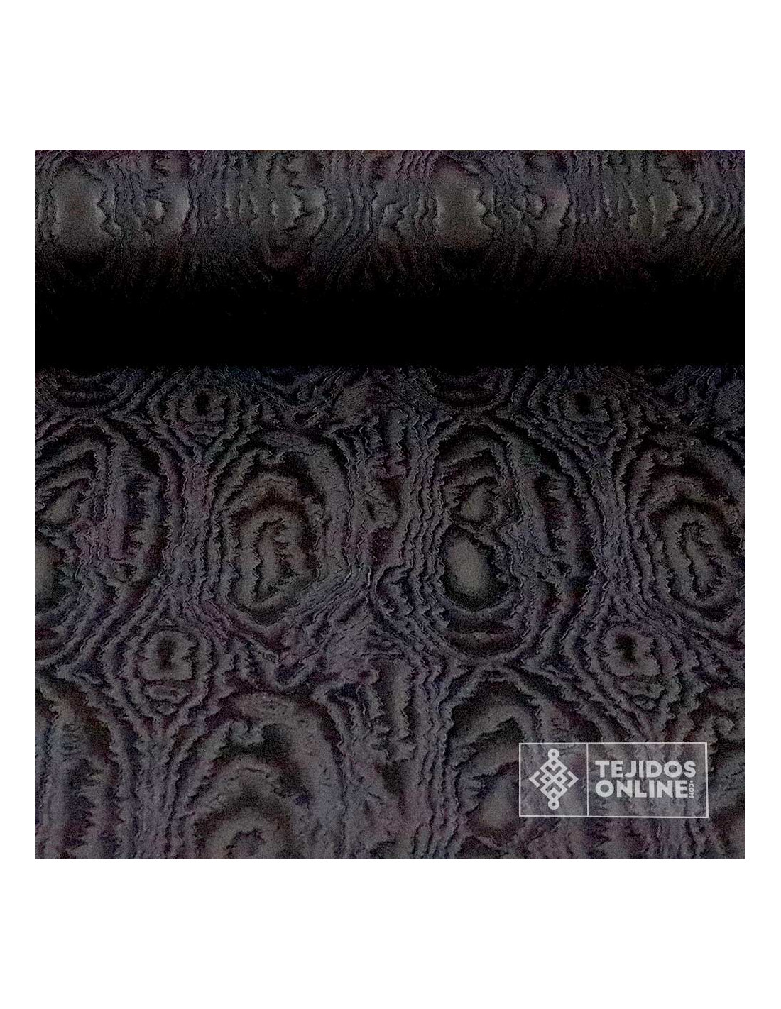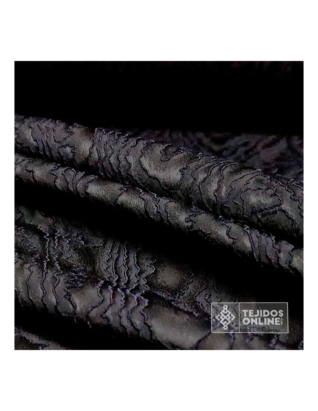 Este Satén Lycra Relieve Moaré destaca por su efecto texturizado y ondas, con un relieve elegante. Su mezcla de poliéster y elastano ofrece un tacto suave, una ligera elasticidad y una caída fluida, ideal para crear prendas de moda. El color negro y azul marino realza aún más el diseño moderno.
