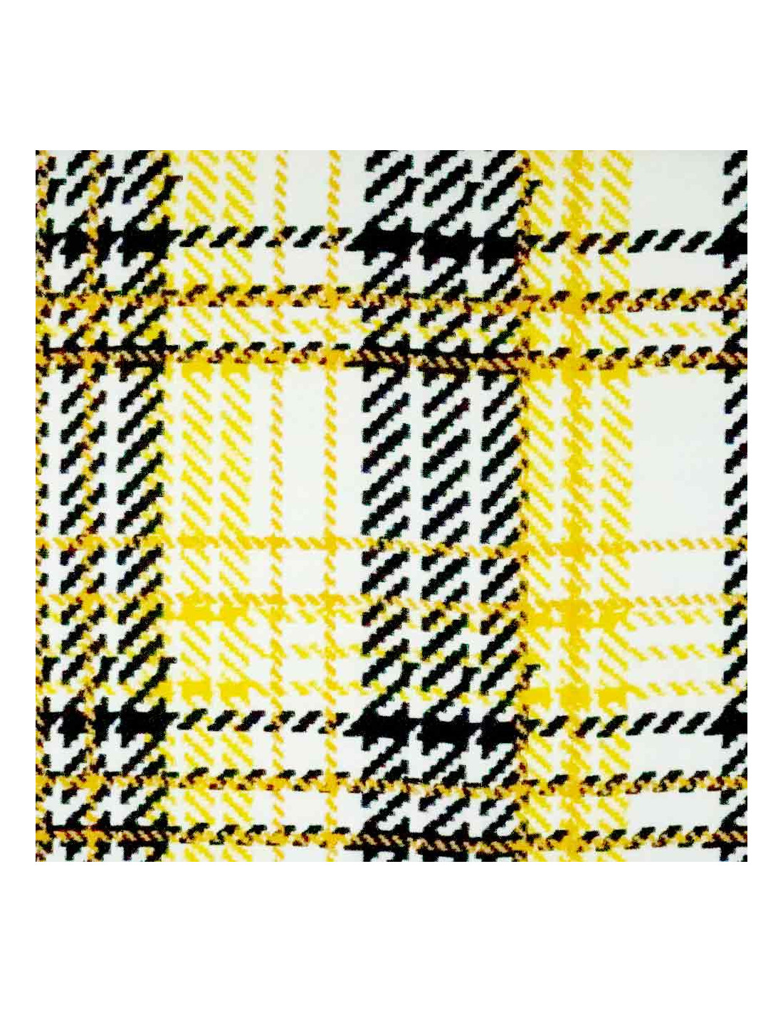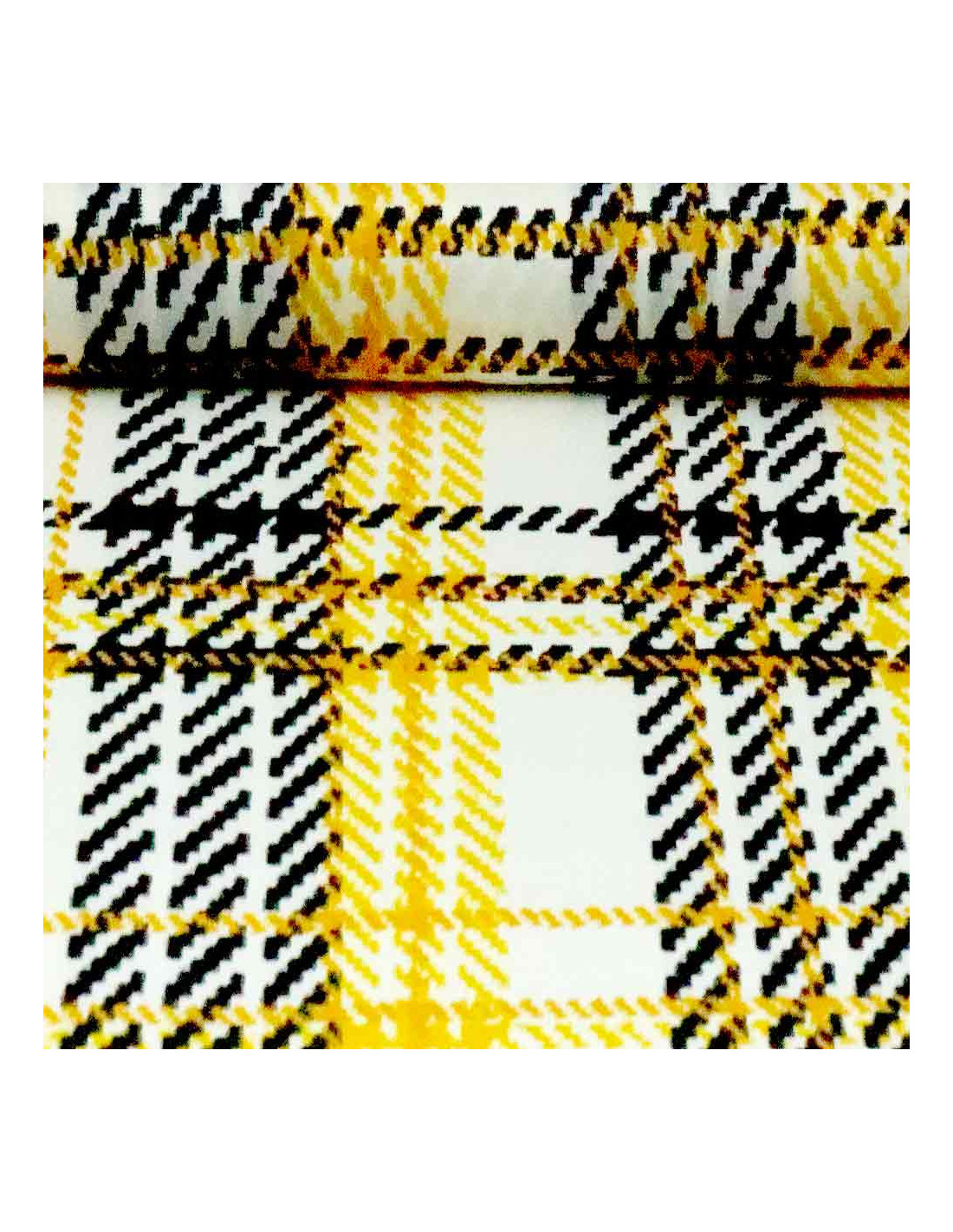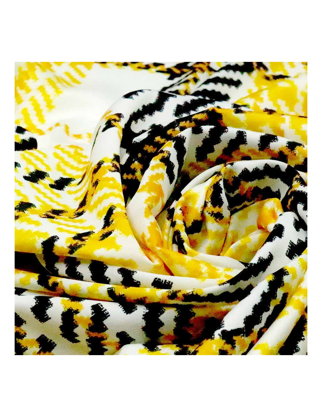 Tela de Seda Raso Estampada Pata Gallo, tejido de cierta finura, suavidad, con gran caída y de textura sedosa. Tejido con estampaciones de la conocida pata de gallo en tonos amarillos y negros, formando cuadros de diferentes tamaños. Tela que no ofrece resistencia al corte, tejido utilizado principalmente para confecciones como; (blusas, camisas, faldas, vestidos, etc…).