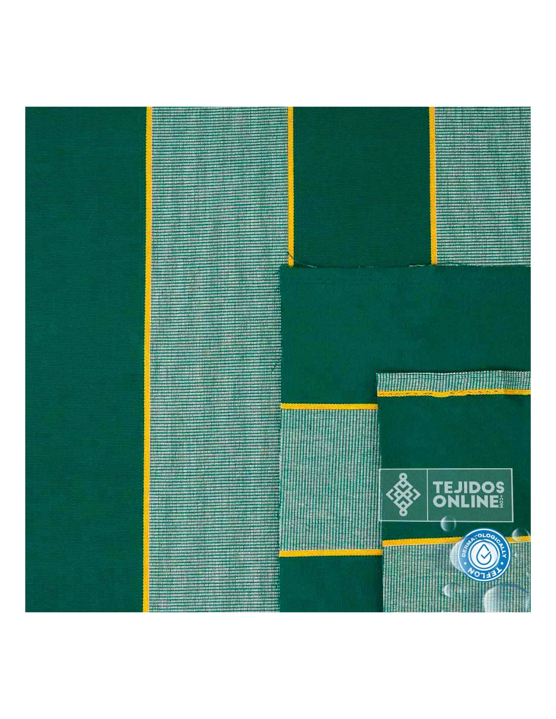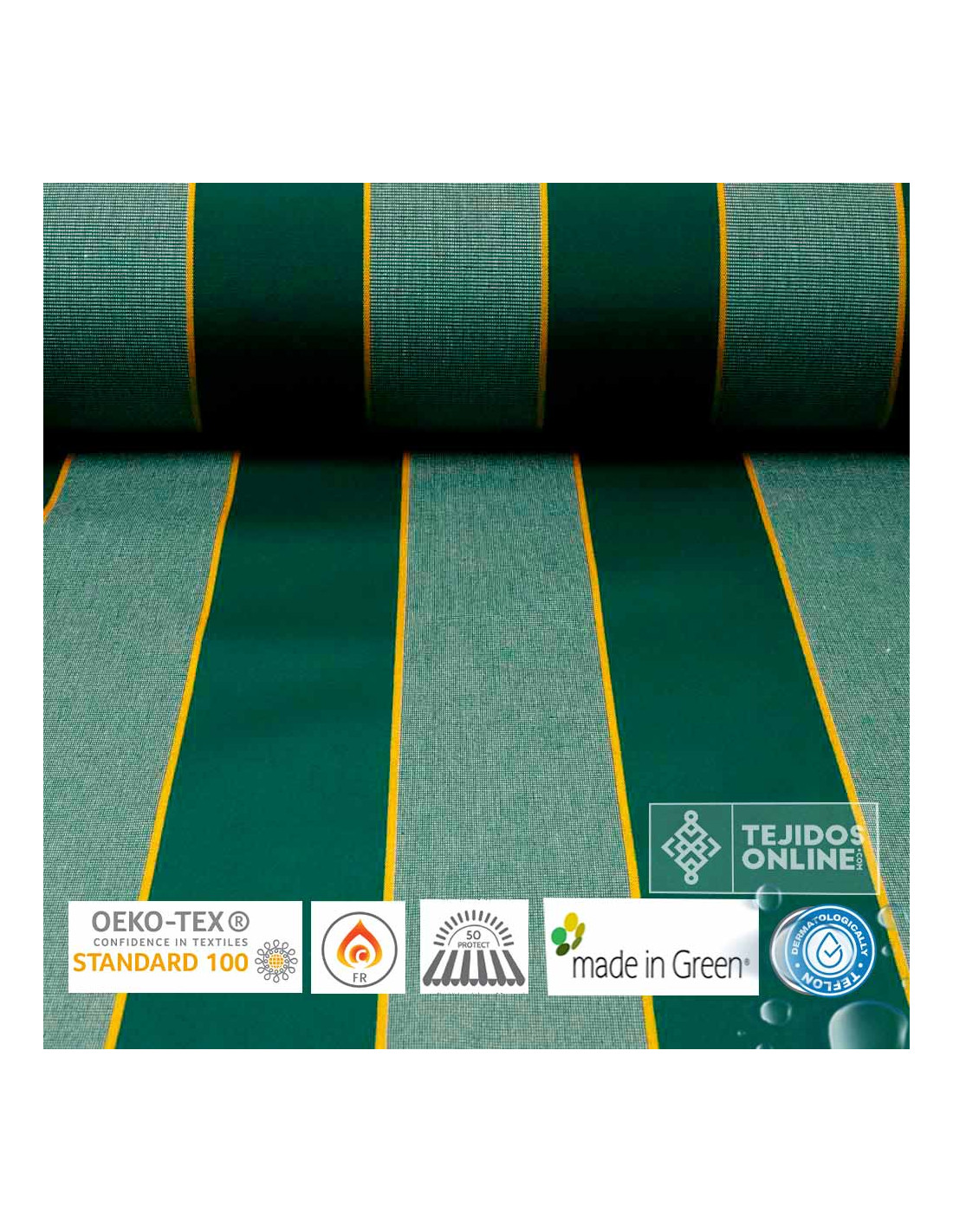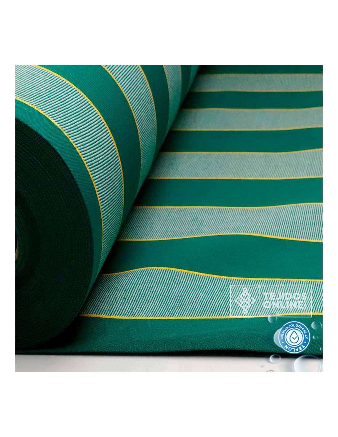 Esta tela de toldo con rayas en color verde y rayas amarilla finas es ideal para exteriores. Con un ancho de 3,20 metros y compuesta por 70% acrílico y 30% poliéster reciclado, su peso es de 210 gr/m², lo que la hace ligera, muy resistente y fácil de coser. Ofrece resistencia al agua, perfecta para terrazas, balcones, pérgolas o escaparates de tienda. Aunque no es 100% impermeable, si se instala bien tensada puede aguantar lluvias intensas ya que por su tratamiento de teflón hace que el agua resvale. Evita pliegues o “bambas” que puedan acumular agua para mantener su correcta funcionalidad.