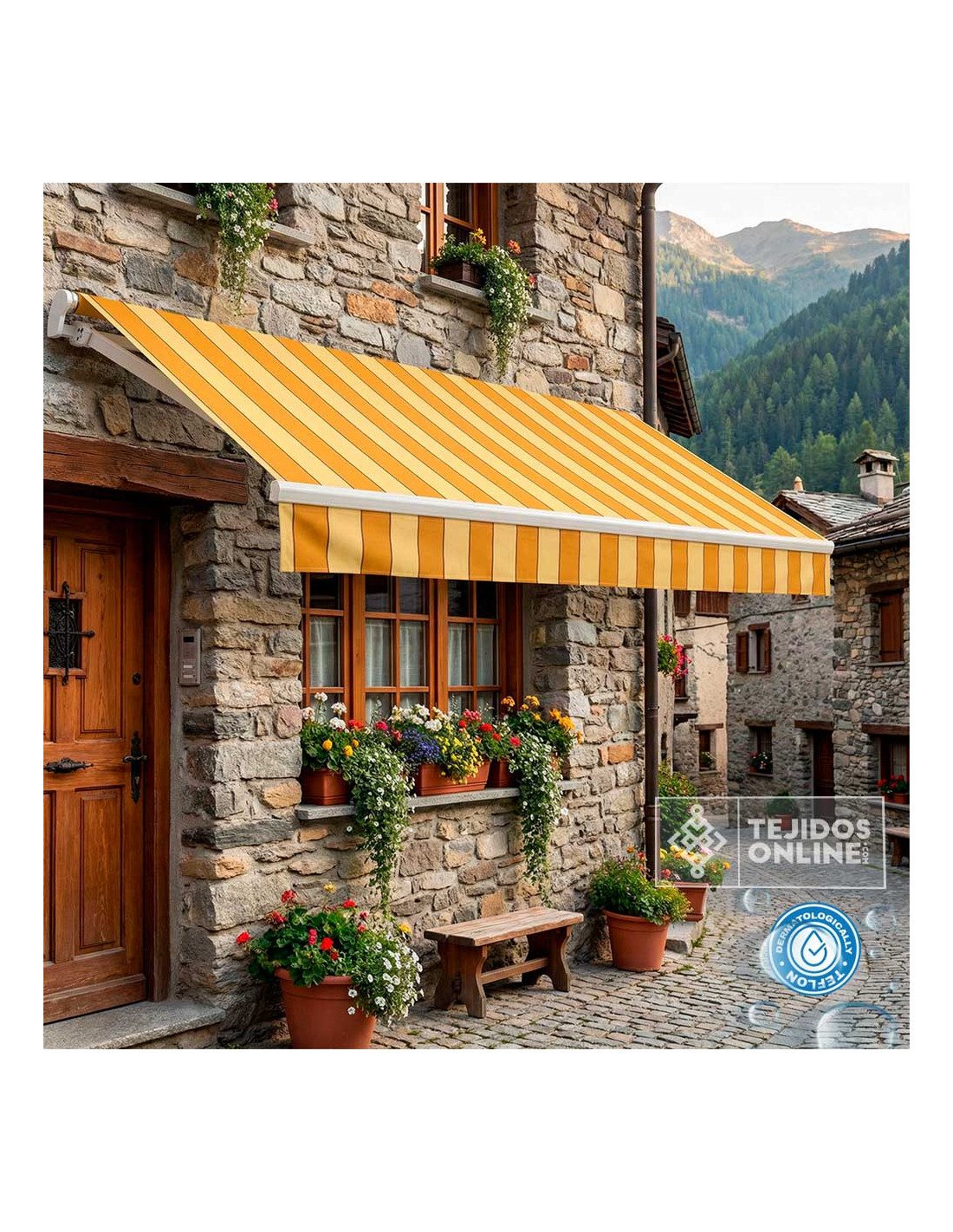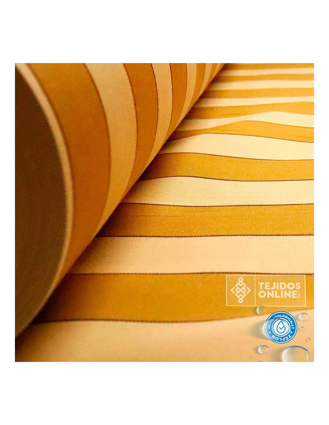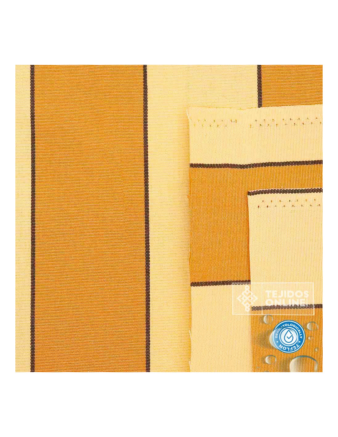 Esta tela de toldo con rayas en tonos albero o mostaza es ideal para exteriores. Con un ancho de 3,20 metros y compuesta por 70% acrílico y 30% poliéster reciclado, su peso es de 210 gr/m², lo que la hace ligera, muy resistente y fácil de coser. Ofrece resistencia al agua, perfecta para terrazas, balcones, pérgolas o escaparates de tienda. Aunque no es 100% impermeable, si se instala bien tensada puede aguantar lluvias intensas ya que por su tratamiento de teflón hace que el agua resvale. Evita pliegues o “bambas” que puedan acumular agua para mantener su correcta funcionalidad.